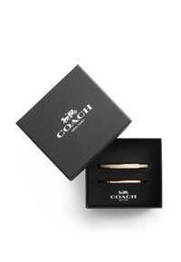 Ensemble de deux bracelets rigides comprenant un bracelet rigide de tous les jours avec le logo emblématique et un bracelet rigide en métal assorti orné de quelques pierres en cristal. L'ensemble comprend 2 bracelets rigides séparés à assortir. Les bracelets s'enfilent facilement. Fabriqués en laiton, émail et cristal de verre. Livrés dans un coffret cadeau COACH.