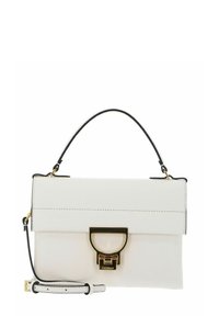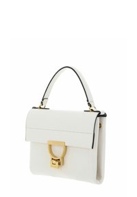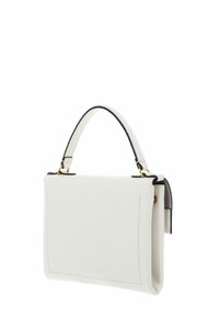 Sac à main rectangulaire blanc avec bordure noire, ferrures dorées et une seule poignée noire arquée sur le dessus.