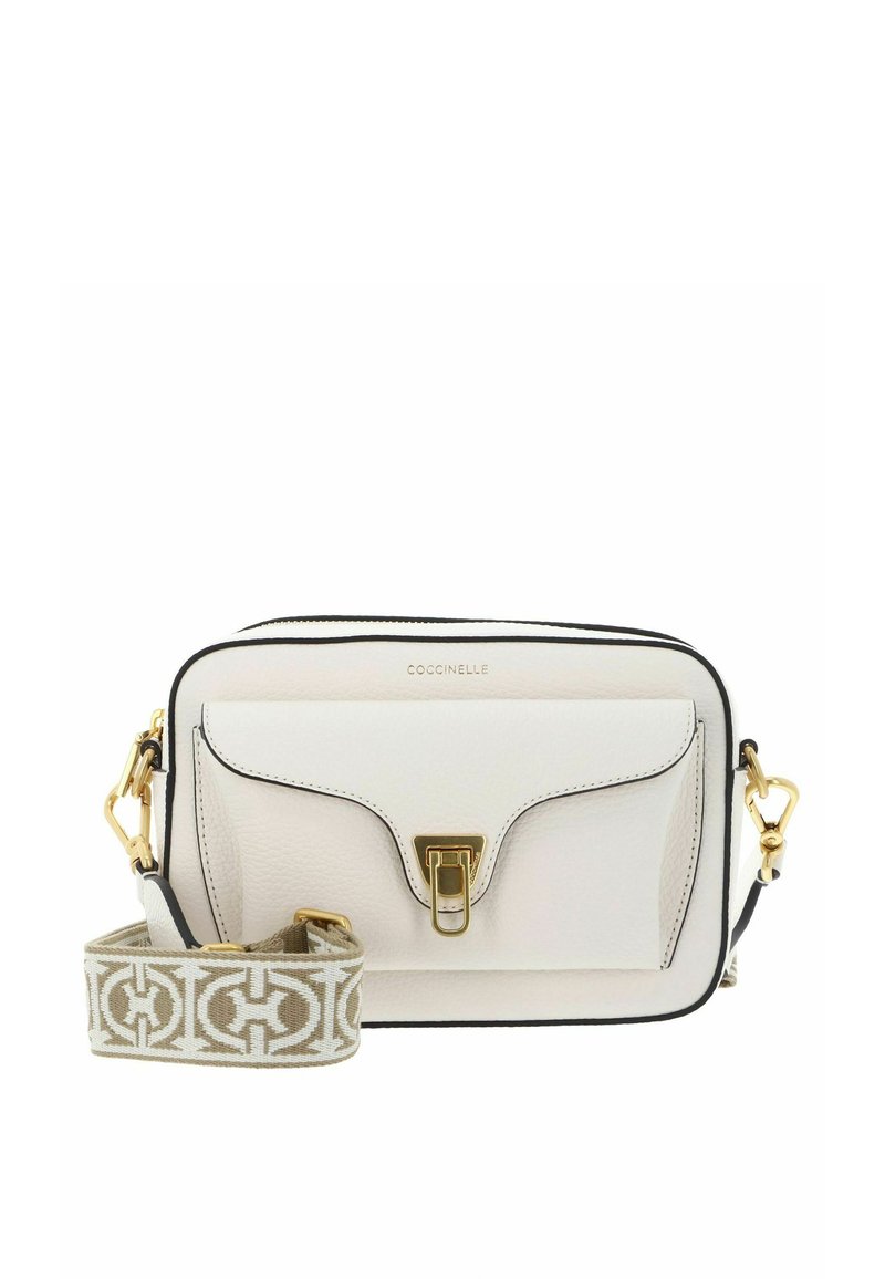 Sac bandoulière rectangulaire en cuir blanc avec fermoir doré, bordures noires, poche avant, et sangle ajustable beige à motifs.