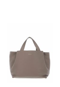 Sac à main en cuir beige avec des poignées courtes, ornée d'une boucle dorée. Le modèle porte un manteau oversized marron et des bottines à chevilles marron foncé.