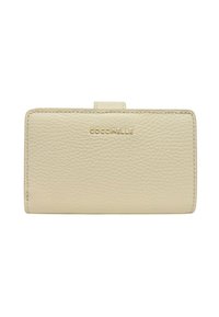 Portefeuille plié en cuir rouge avec logo doré "Coccinelle" et fermeture à pression, présenté sur fond blanc.