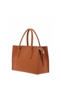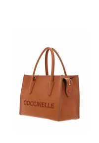Sac à main en cuir marron avec double poignée et bandoulière amovible, avec le logo "COCCINELLE" embossé à l'avant.