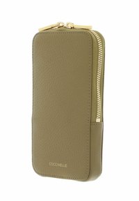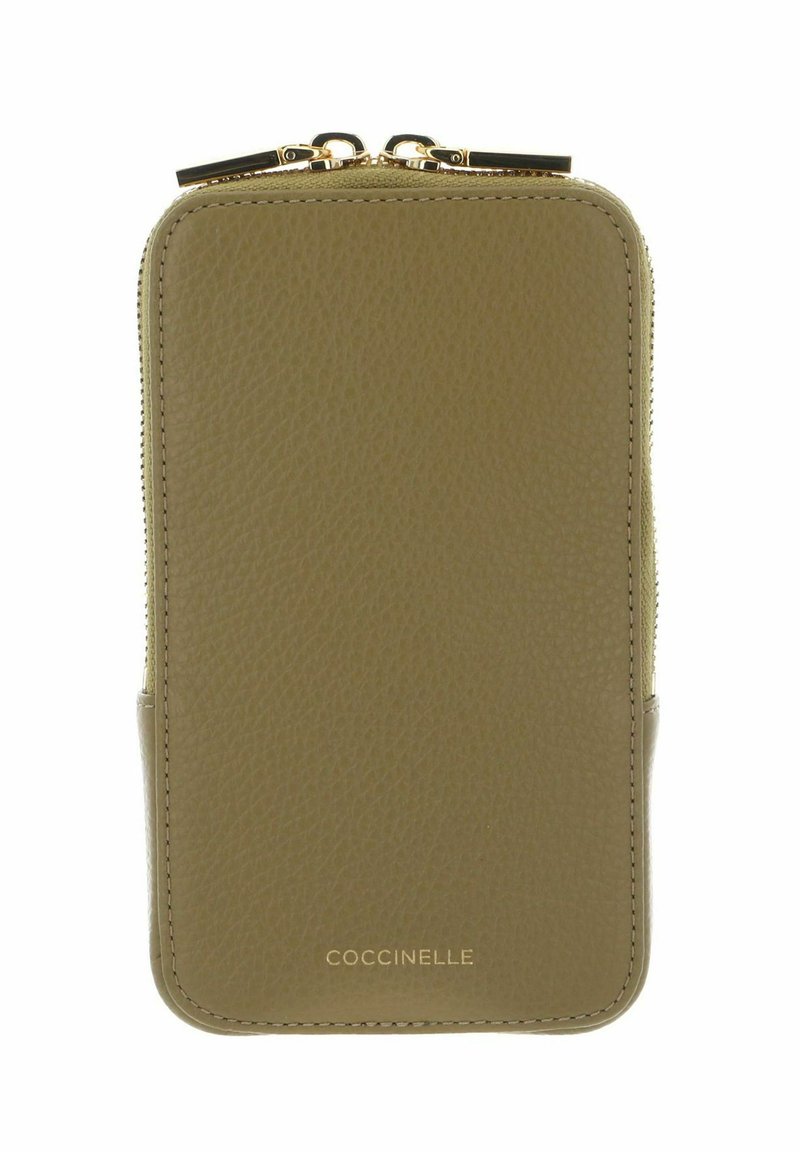 Portefeuille rectangulaire en cuir vert olive avec fermetures éclair dorées et logo COCCINELLE en bas au centre.