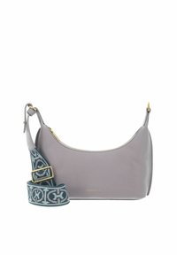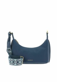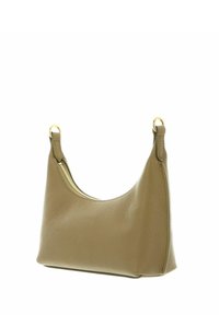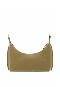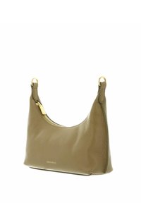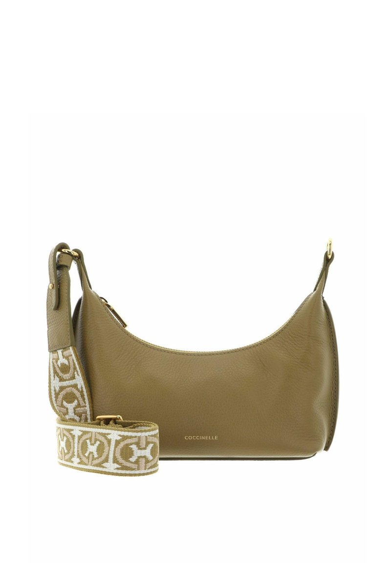Sac à bandoulière en cuir vert olive avec une large sangle à motifs et une fermeture éclair ainsi que des détails dorés, marqué "Coccinelle" à l'avant.