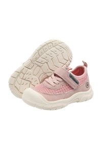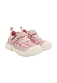 Baskets en maille et daim roses avec une bride auto-agrippante, dotées d'une semelle texturée et d'un embout en caoutchouc blanc contrastant. Logo sur le côté.