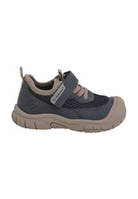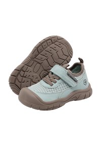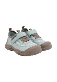 Chaussures pour enfants en maille bleu clair et daim avec une semelle en caoutchouc marron et un bout renforcé, dotées d'une bride velcro et d'accents texturés.