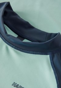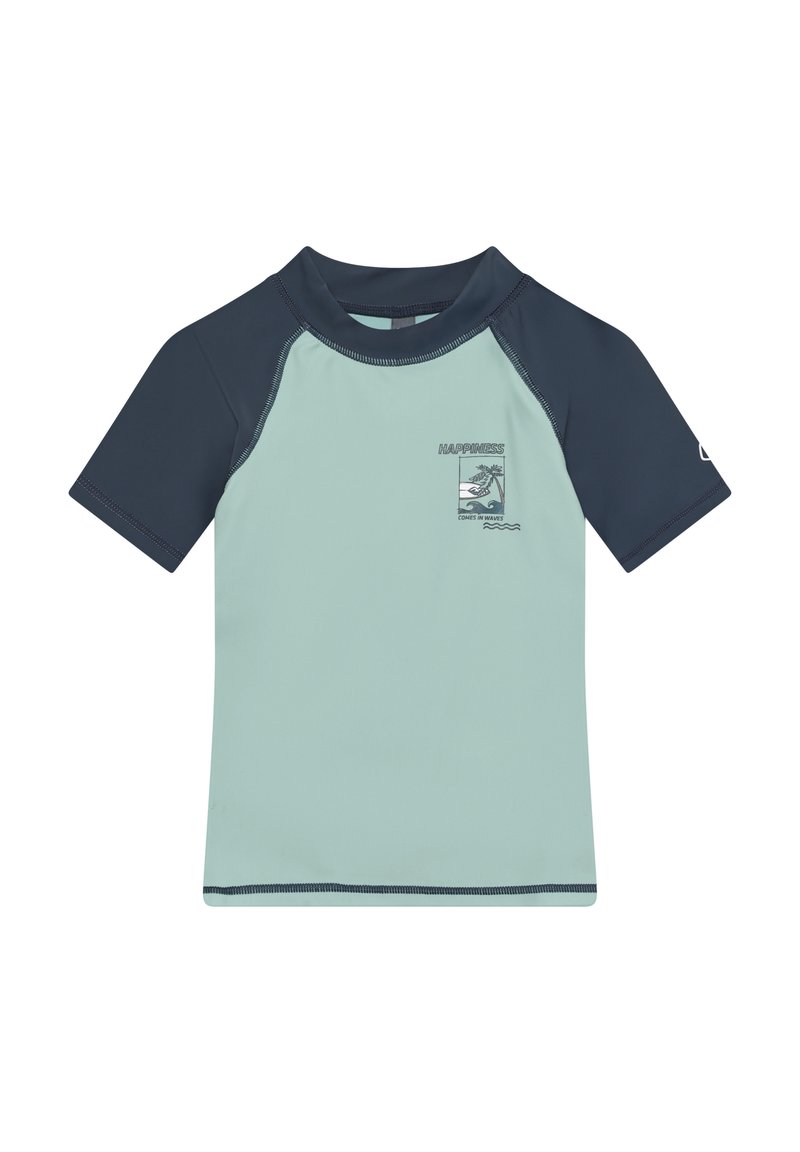 Maillot de protection anti-UV bleu clair et marine à manches courtes avec le texte "Le bonheur vient en vagues" et un graphisme de vague sur la poitrine avant.