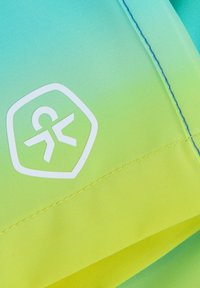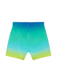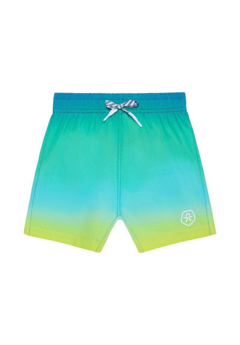 Shorts de bain dégradés aux couleurs passant du bleu au vert puis au jaune, avec une ceinture élastique, un cordon blanc et un petit logo blanc sur la jambe gauche.