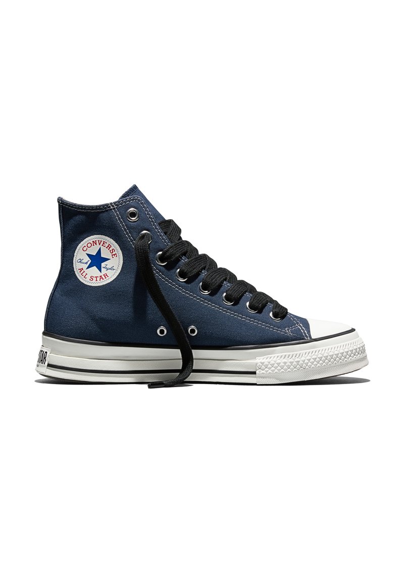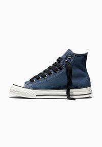 Baskets montantes Converse Chuck Taylor All Star bleu marine avec lacets noirs et semelle en caoutchouc blanche, vues de profil sur fond blanc.