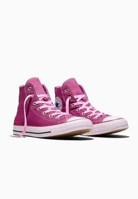 Baskets montantes Converse Chuck Taylor All Star magenta avec semelle en caoutchouc blanche et embout, lacets roses et logo de la marque visible à la cheville.