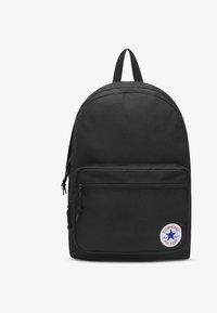 Sac à dos Converse bleu marine avec poche zippée à l'avant et écusson rond du logo Chuck Taylor All Star dans le coin inférieur droit.