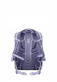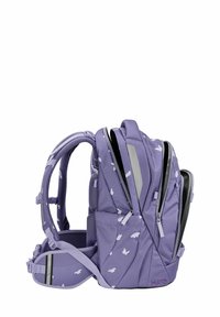 Sac à dos violet avec des motifs de papillons, compartiments zippés, bretelles réglables et fond renforcé. Tissu solide avec une texture lisse.