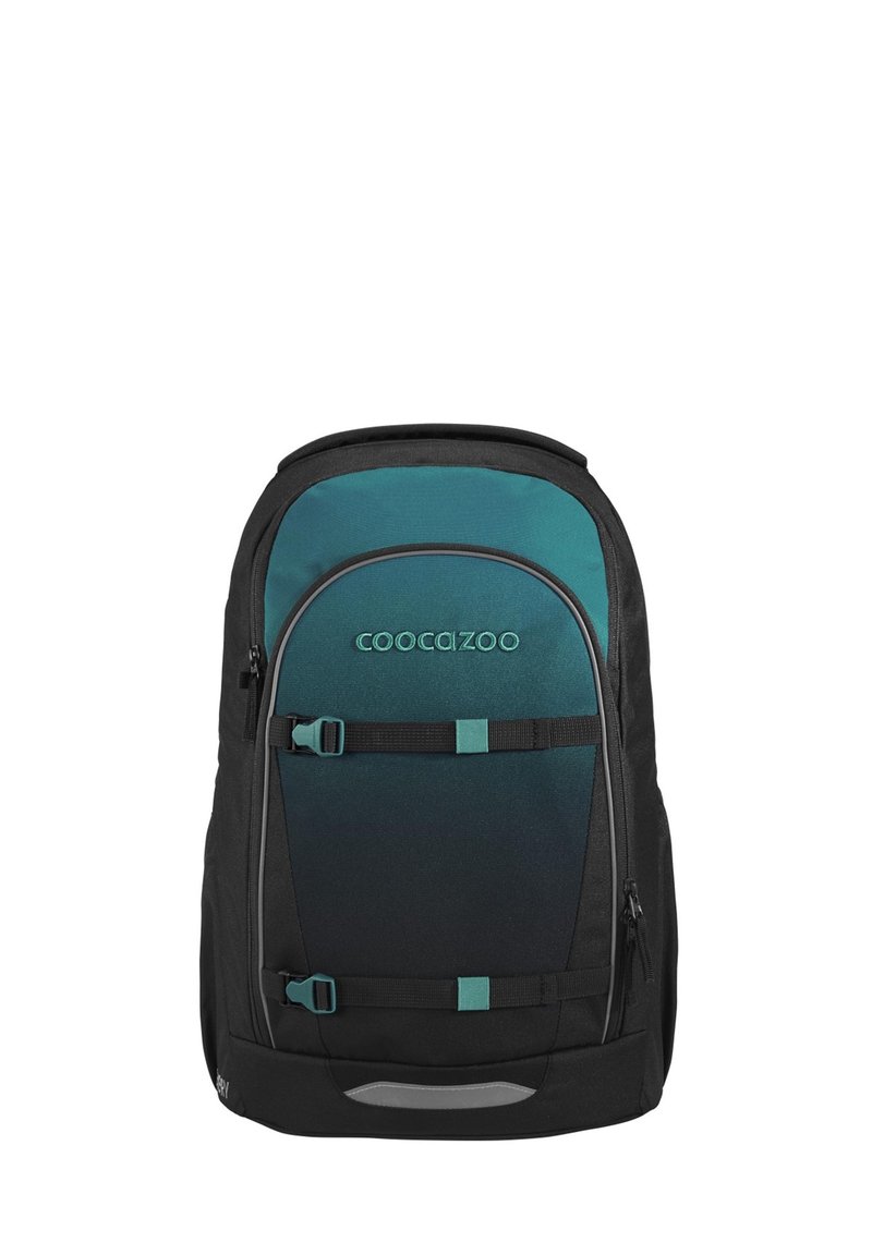 Sac à dos Coocazoo noir et bleu sarcelle avec deux bretelles avant réglables et un compartiment principal zippé.