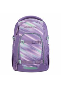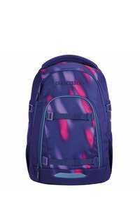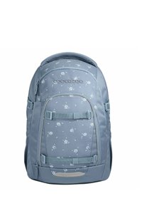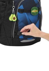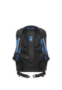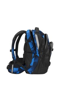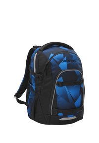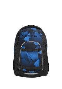 Sac à dos scolaire bleu et noir avec un motif géométrique, poche avant zippée, bretelles réglables et logo Coocazoo sur le devant en haut.