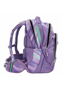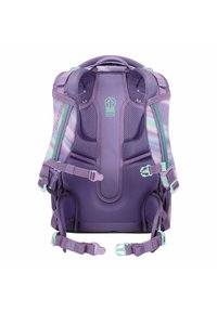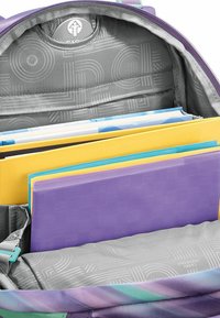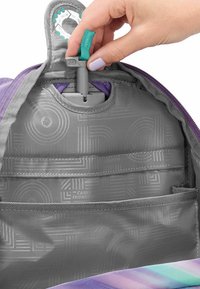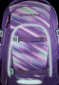 Sac à dos violet avec des rayures diagonales pastel vertes et roses. Il comprend des bretelles réglables, des poches latérales et une fermeture éclair. Tissu durable.