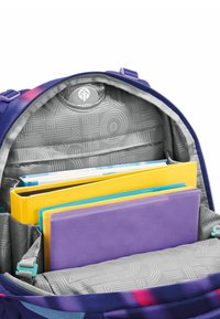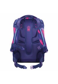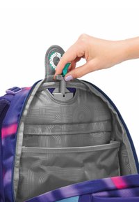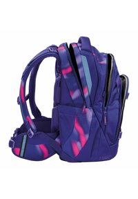 Sac à dos violet avec un design dégradé et des accents roses. Fabriqué en tissu durable, il comprend des bretelles réglables et des fermetures éclair.