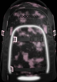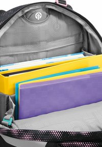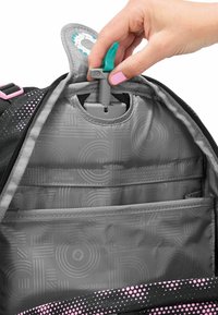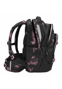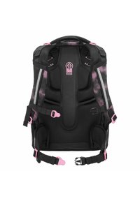 Sac à dos noir avec des accents à motifs de points roses, plusieurs sangles ajustables et une poche frontale zippée. Dispose d'un dos et de bretelles rembourrés.