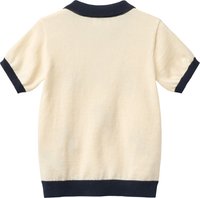 Jeune garçon portant un polo beige avec un col noir et une broderie de surfeur kangourou, assis sur des marches en bois, regardant sur le côté.