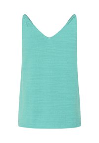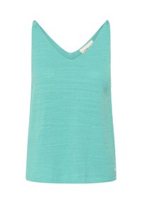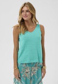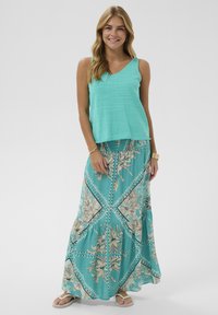 Jeune femme aux longs cheveux blonds portant un haut turquoise sans manches et une jupe à motif floral, souriante et regardant légèrement sur le côté.