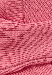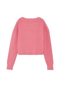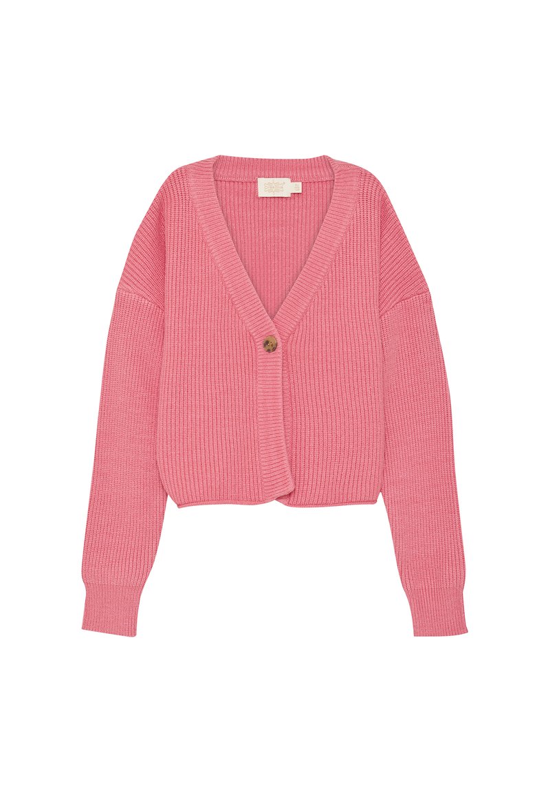 Cardigan tricoté rose avec manches longues, encolure en V profonde et fermeture à bouton en bois unique à l'avant. Texture côtelée sur toute la surface.