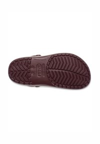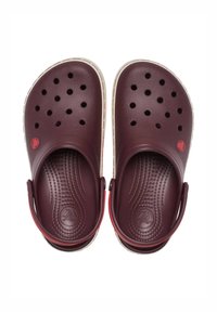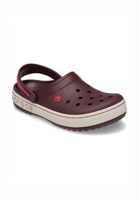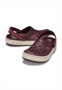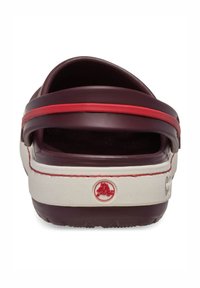 Sabot Crocs bordeaux avec des trous de ventilation, une semelle intermédiaire blanche avec le logo "crocs", et une bride de talon ajustable accentuée de rouge.