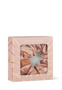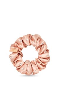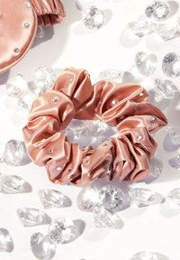 • 1 x chouchou en soie or rose d'un diamètre d'environ 12 cm, orné de cristaux, fabriqué à partir de soie de mûrier 22 momme, classe 6A. Possède un intérieur élastique