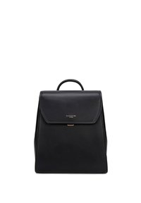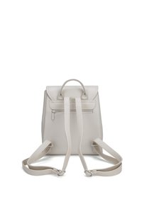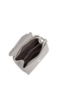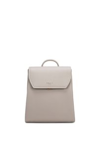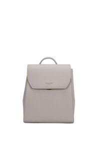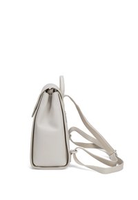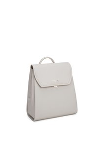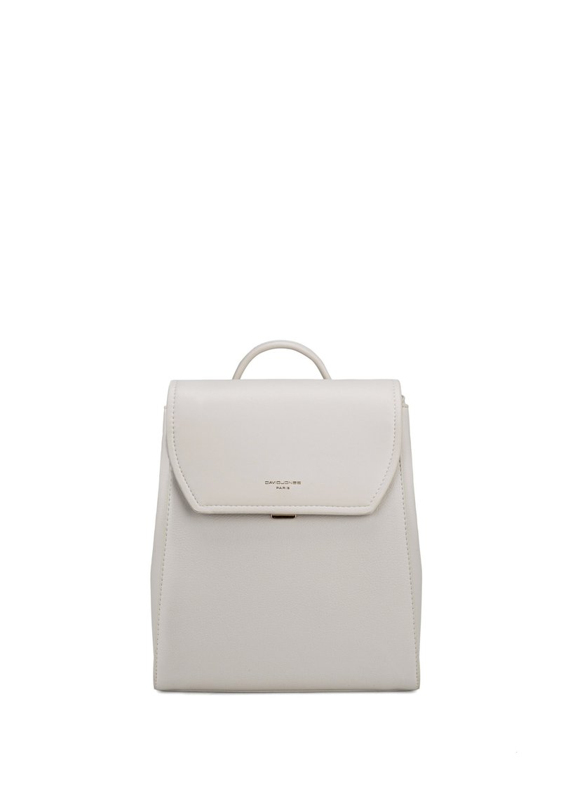 Petit sac à dos gris clair avec une poignée sur le dessus, fermeture à rabat et un logo discret "David Jones Paris" sur le devant.