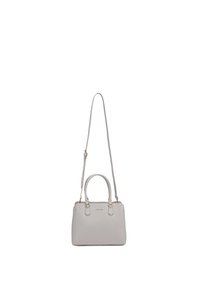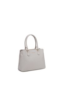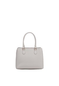 Sac à main structuré gris clair avec doubles poignées, quincaillerie dorée et petit nom de marque embossé centré sur le devant.