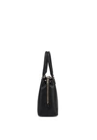 Sac à main en cuir texturé noir avec doubles poignées et pièces dorées, avec un petit logo de marque centré sur le devant.