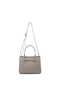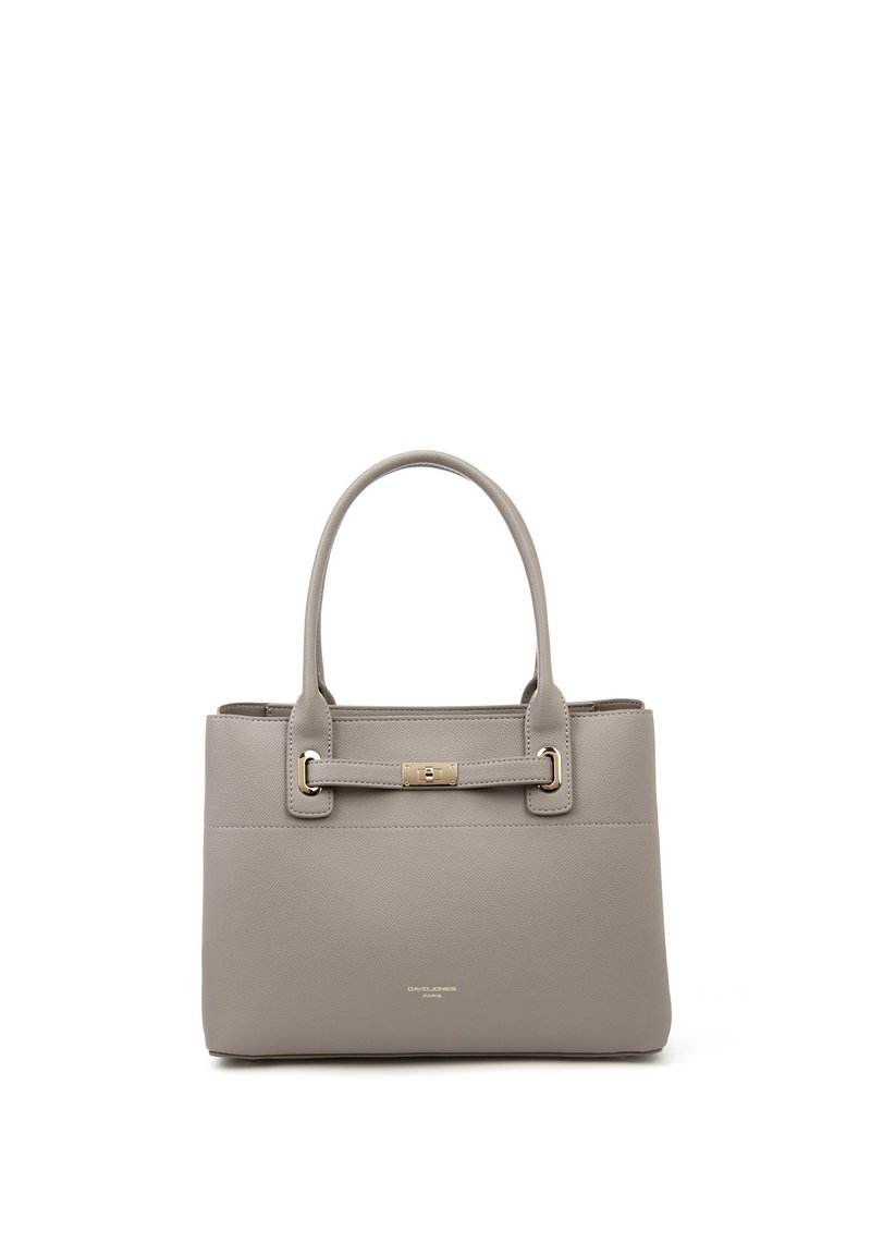 Sac à main rectangulaire gris avec deux poignées, une sangle horizontale avec une petite boucle dorée et une surface subtilement texturée.