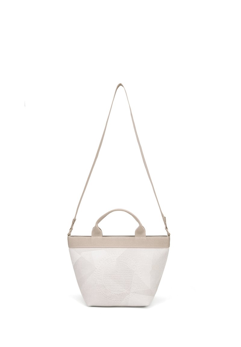 Petit sac fourre-tout beige avec texture en tissu, poignées courtes et longue bandoulière réglable, sur fond blanc uni.