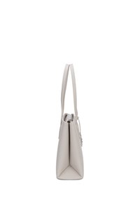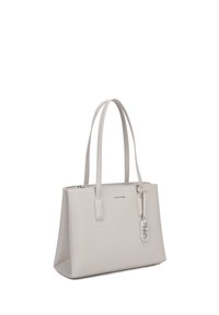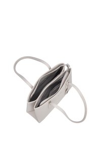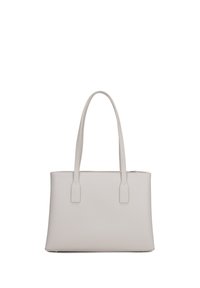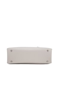Sac à main structuré en cuir gris clair avec deux longues poignées, petite étiquette en cuir attachée et logo discret de la marque au centre devant.