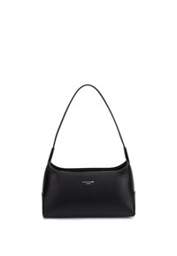 Sac à épaule en cuir noir élégant avec une seule longue bandoulière, forme rectangulaire et petit logo argenté centré près du haut.