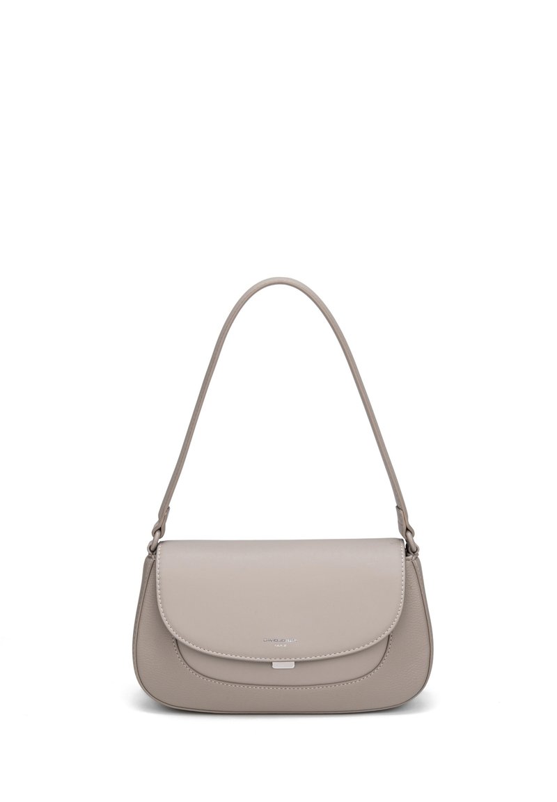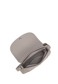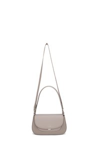Sac à main bandoulière en cuir taupe avec rabat incurvé et une bandoulière unique, ferrures minimalistes couleur argent et logo embossé discret sur l'avant.