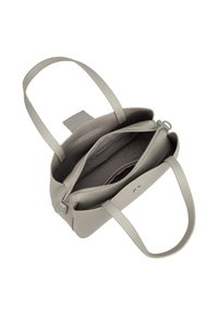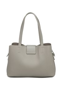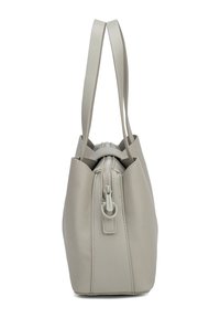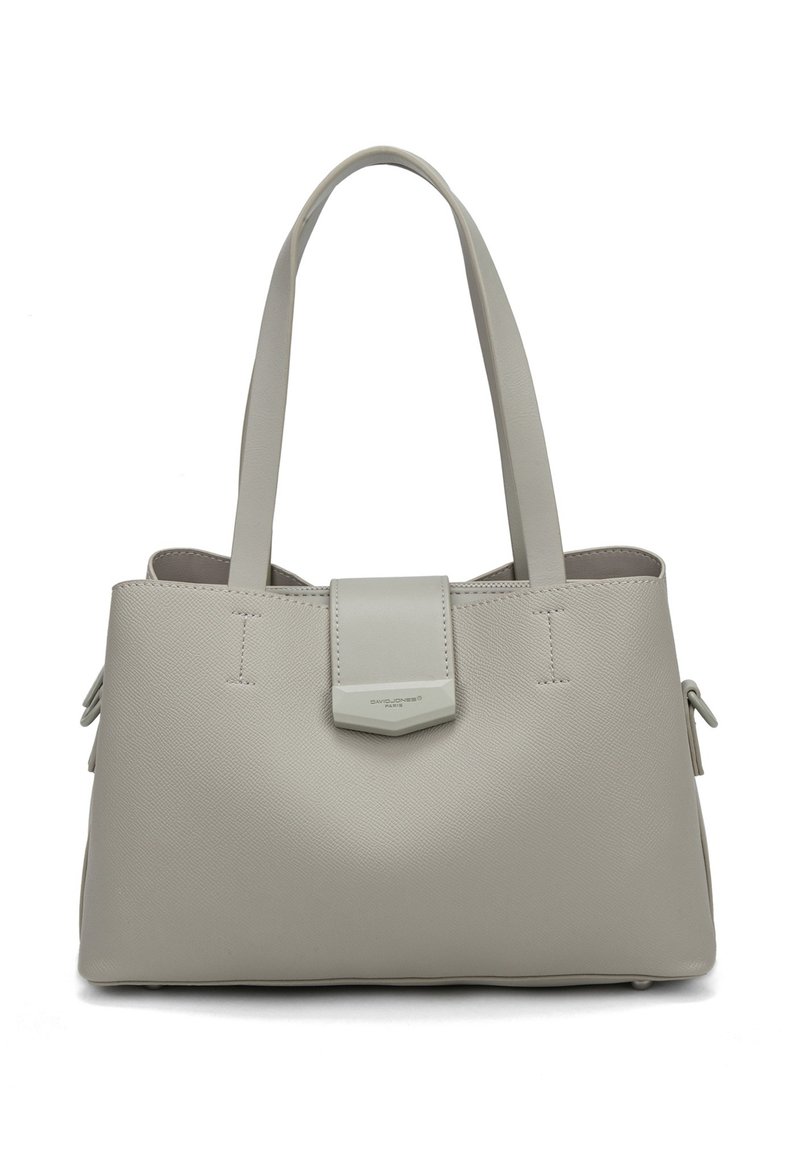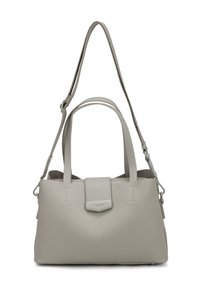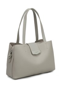 Sac cabas en cuir gris clair avec deux anses, fermeture à rabat avant et détails subtils de texture.