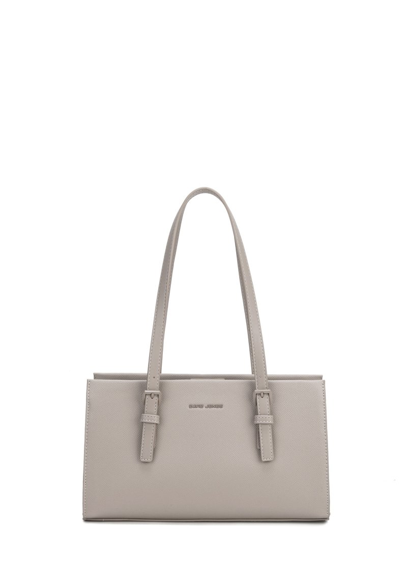 Sac à main rectangulaire gris clair avec deux bretelles ajustables et un petit logo de marque embossé au centre avant.