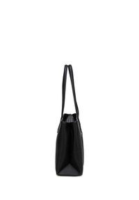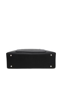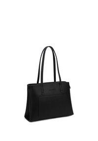 Sac cabas en cuir noir avec longues anses, poche avant et fermeture éclair sur le dessus, conçu pour un usage quotidien.