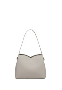 Sac à épaule en cuir gris clair avec design à panneaux courbés et fine sangle, petit logo de marque embossé centré à l'avant.