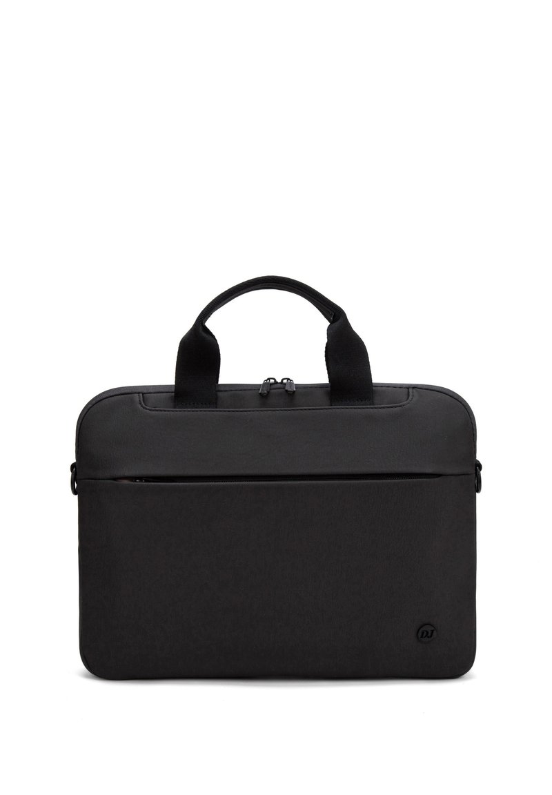 Sacoche noire pour ordinateur portable avec doubles poignées, poche avant zippée et petit logo circulaire en bas à droite, présenté sur fond blanc.