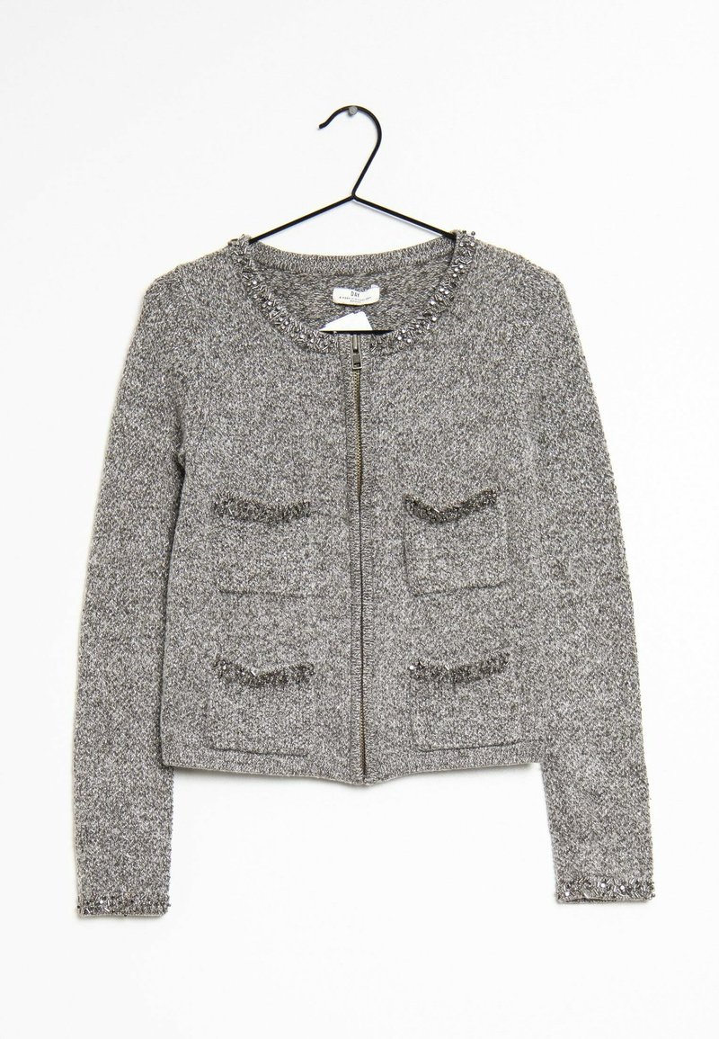Cardigan gris tricôté à manches longues avec fermeture éclair sur le devant, quatre poches avant et perles décoratives sur le col, les bords des poches et les poignets, suspendu à un cintre noir.