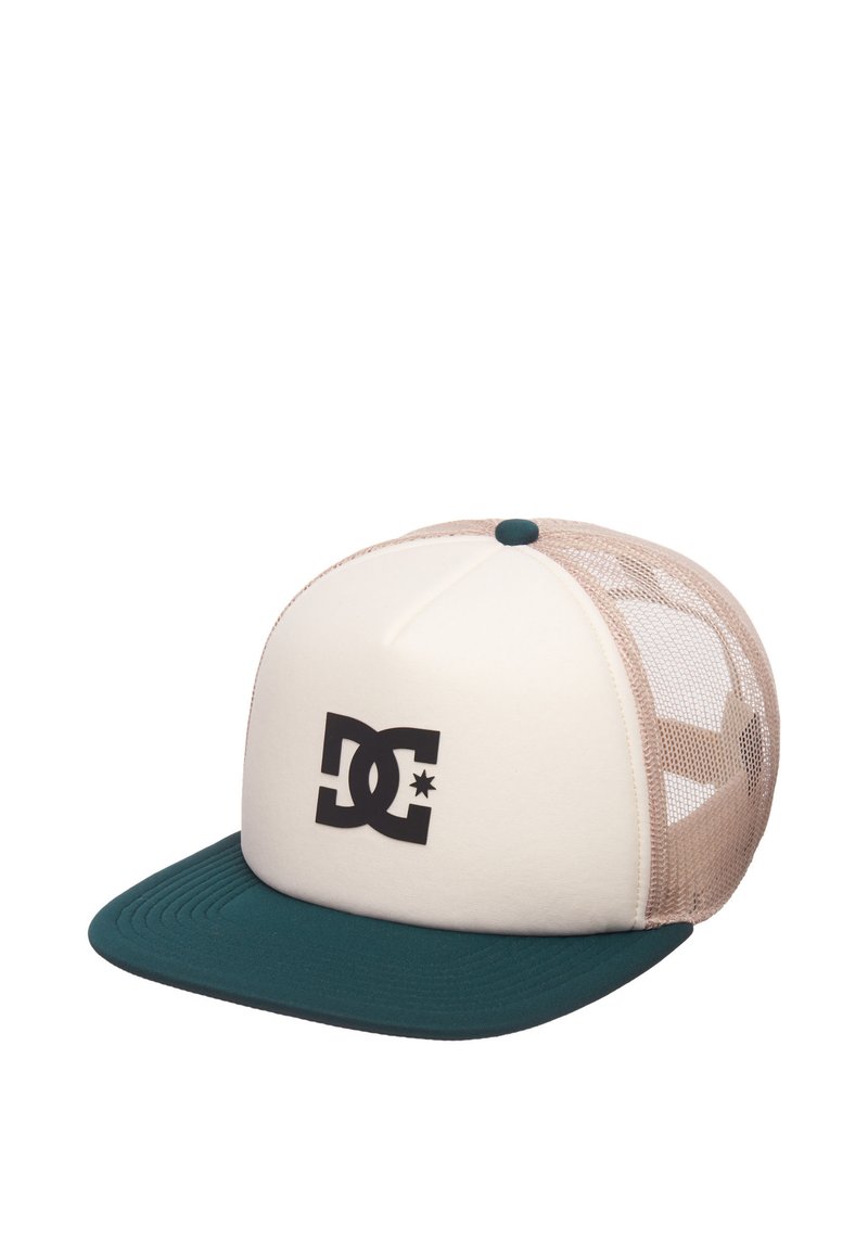 Casquette de camionneur avec devant structuré crème, côtés en maille beige et visière turquoise. Présente un logo DC noir bien en vue à l'avant.