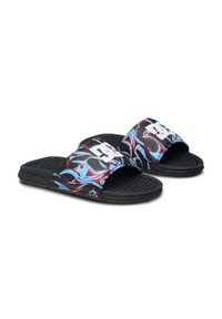 Sandale à glissière noire avec une semelle épaisse et une bride présentant des motifs abstraits rouges, bleus et blancs, vue de côté sur un fond blanc.