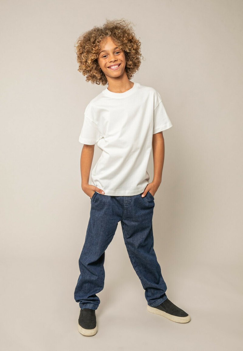 Enfant souriant aux cheveux bouclés portant un t-shirt blanc uni, un jean bleu large et des chaussures noires sans lacets, debout les mains dans les poches.
