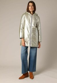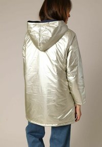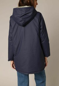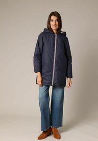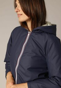 Veste imperméable bleu marine avec capuche, dotée d'une fermeture éclair à l'avant avec accents rouges et blancs, et d'une coupe décontractée avec des manches longues.