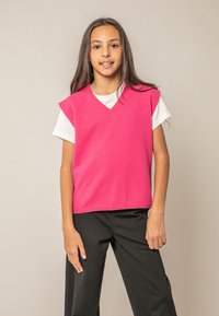 Fille souriante aux longs cheveux bruns, portant un pull sans manches rose clair par-dessus un t-shirt blanc, un pantalon large noir et des baskets blanches.