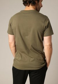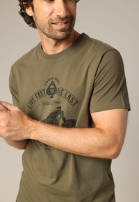 T-shirt vert olive avec un graphique de moto en noir, associé à un pantalon noir et des baskets blanches avec des accents bleus.