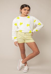 Personne portant un short jaune pâle à ourlet roulé, des baskets blanches avec des bordures rouges et un haut à manches longues blanc avec des motifs de cœurs jaunes.