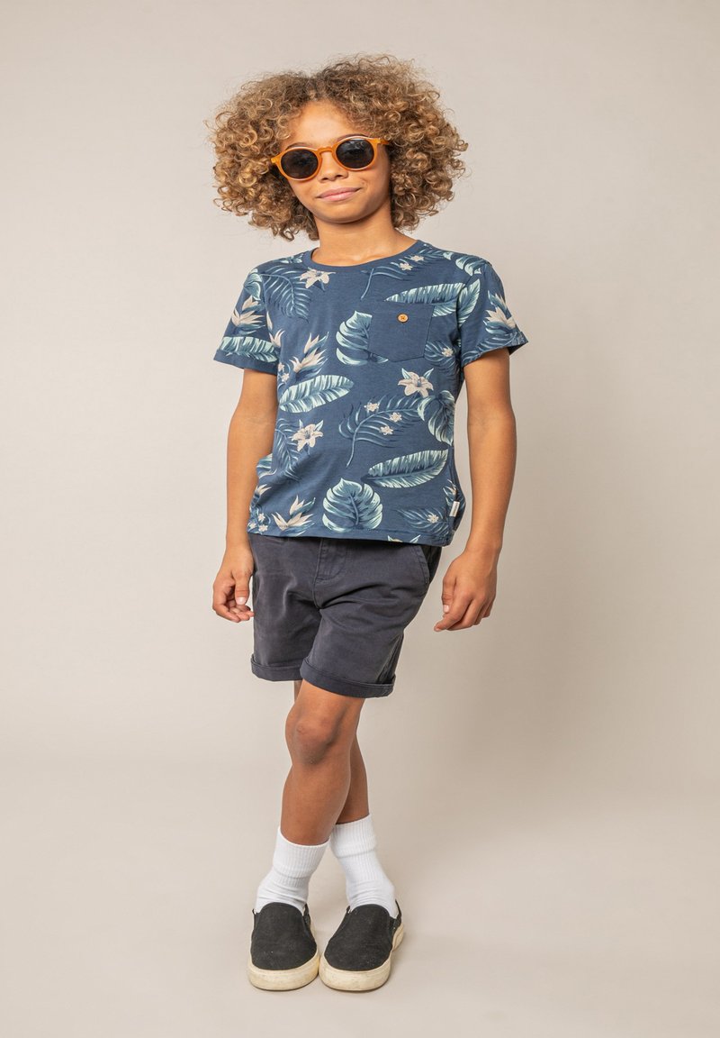 Enfant aux cheveux bouclés portant des lunettes de soleil orange, une chemise bleue à fleurs, un short sombre, des chaussettes blanches et des chaussures noires à enfiler, debout avec les jambes croisées.