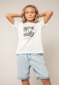 Enfant aux cheveux blonds mi-longs portant un t-shirt blanc avec un motif de palmier et de moto, un short en jean clair, des chaussettes blanches et des baskets beige.
