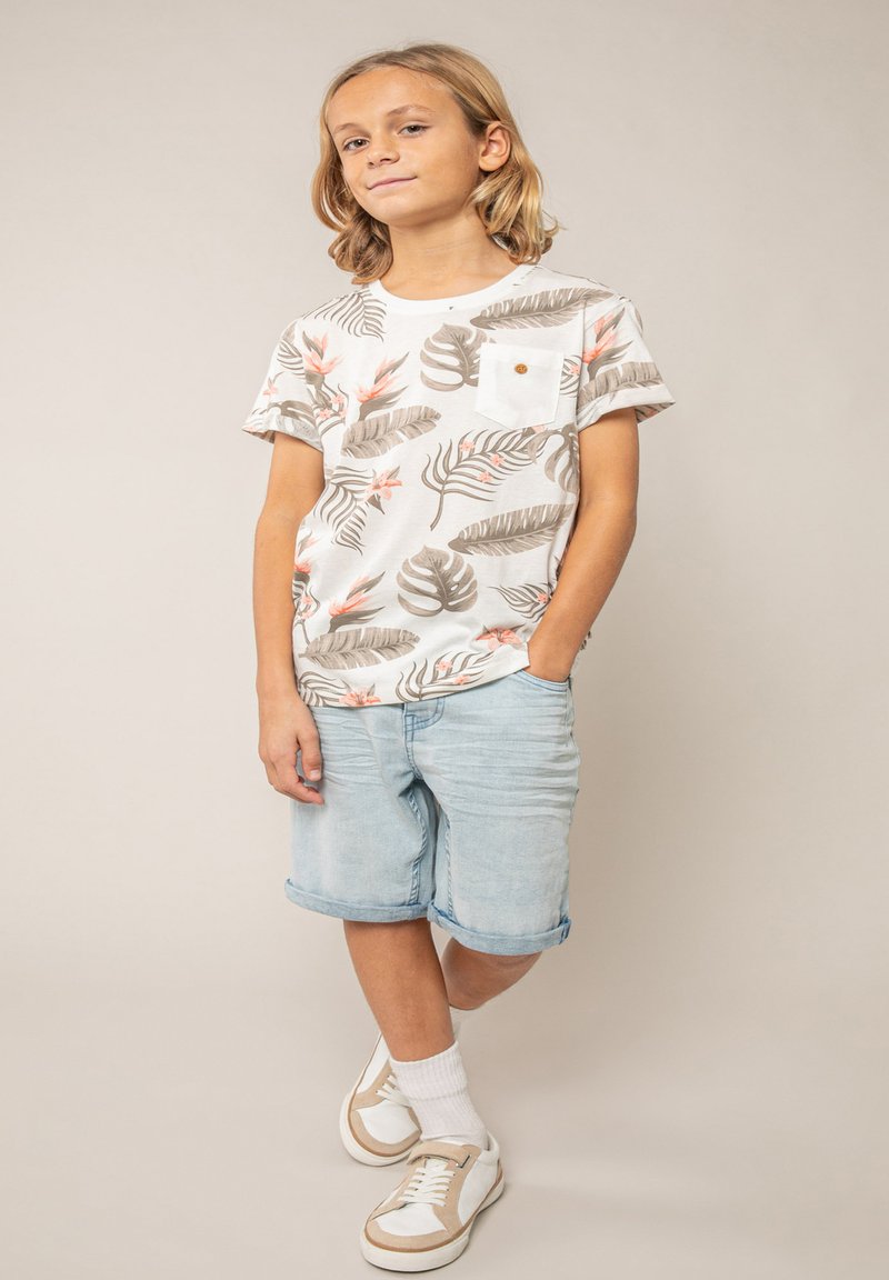 Enfant aux cheveux blonds mi-longs portant un t-shirt à imprimé tropical, un short en jean clair, des chaussettes blanches et des baskets beiges, debout avec une main dans la poche.